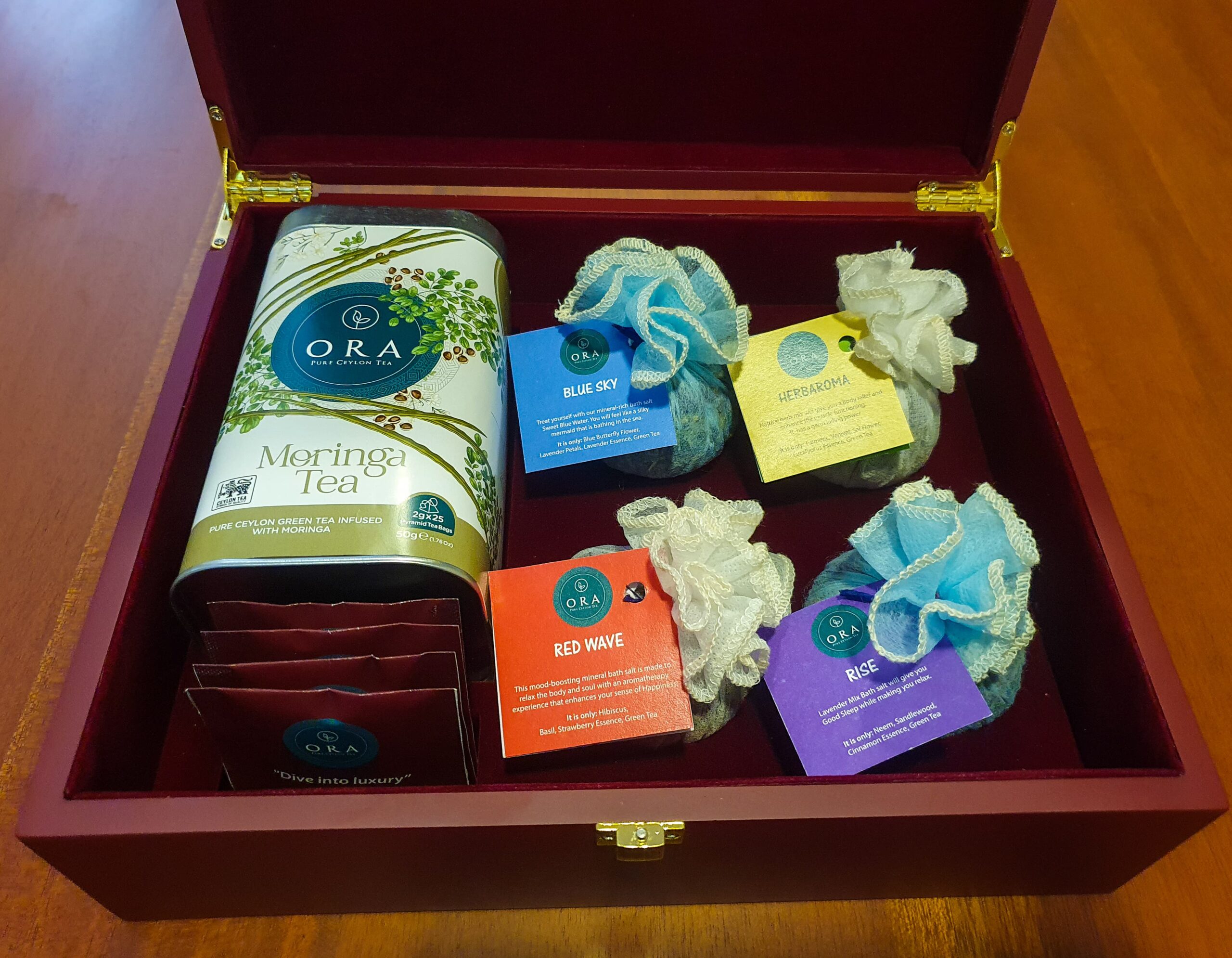 with our premium wellness teas, encased in a sleek wooden box, it’s